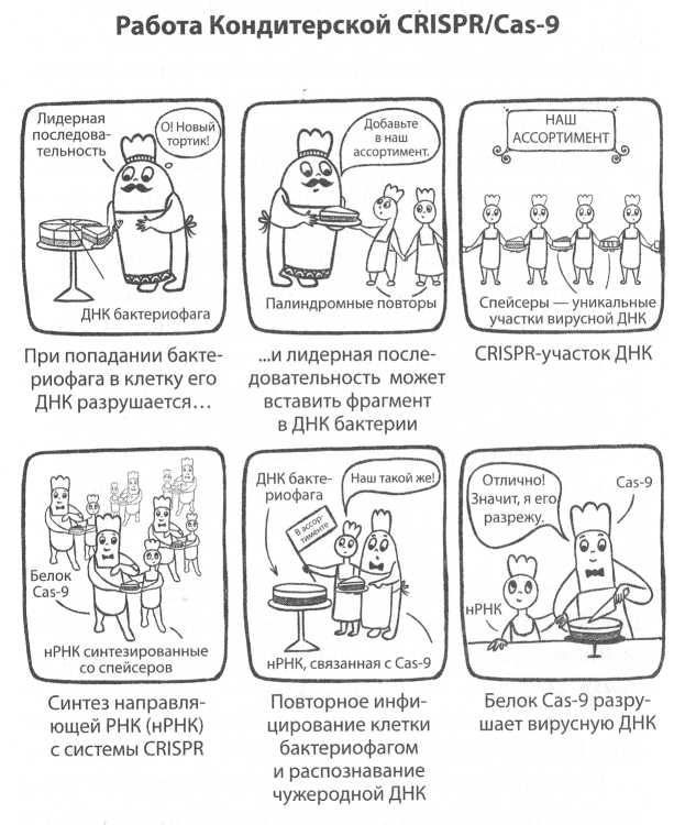 Дальнейшие исследования детально объяснили, каким образом функционирует адаптивный иммунитет бактерии. Оказалось, что он, как и у человека, изначально работает случайным образом. К примеру, в бактериальную клетку проникает чужеродная ДНК бактериофага или плазмиды. Единственное, чем может бактериальная клетка защититься от проникшей в нее чужеродной ДНК, пока еще нет иммунитета, – это расщепить врага, уничтожить целостность генетической информации, то есть порезать ее на маленькие кусочки. Как только клетке удалось разрезать ДНК бактериофага в каком-то месте (а лучше в двух или даже трех местах), молекула вирусной ДНК становится нефункциональной и нанести вред клетке уже не может.