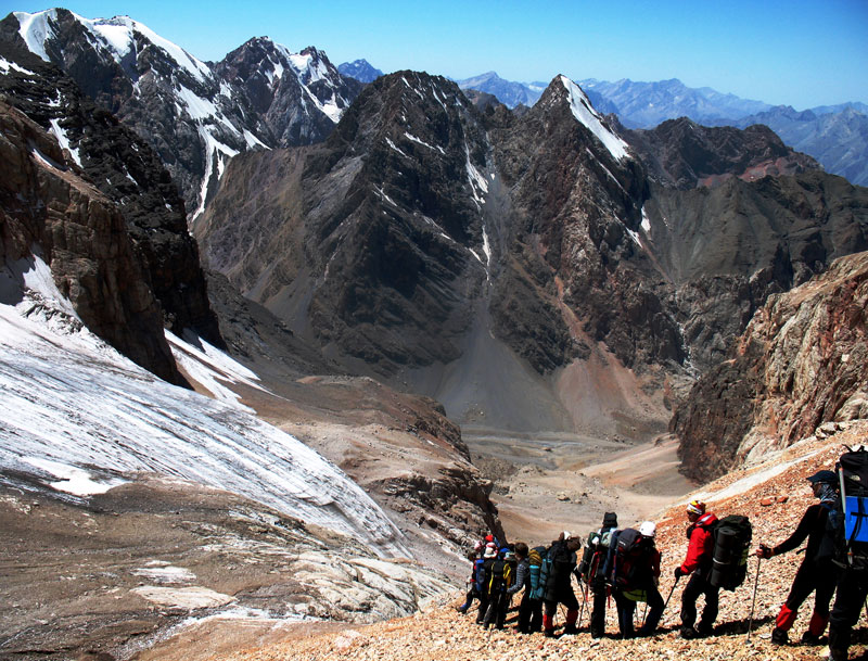После обеда, Валера повёл группу дальше. Подход под перевал Казнок занял часа три. Ночевали недалеко от небольшого ледника и ночью было холодно. С рассветом начали подъём на перевал. Хорошая тропа вела прямо на перевал. На перевале немного передохнули и начали спуск по крутой тропе. Тропа была усеяна мелкой щебёнкой и спускаться по такой тропе было одно мученье. Для меня и мужской части группы, спуск не представлял большой трудности, а вот для большинства женщин, частое соприкосновение пятой точкой с горной тропой, было в порядке вещей. Лариса, это одна из сестёр, при спуске с перевала всё время была рядом со мной, но медленный спуск утомлял меня. Вскоре нашему взору открылся вид долины с небольшой речкой, где мы планировали пообедать. Тропа просматривалась до самого низа без всяких проблем. Мы с Валерой решили отправить несколько человек вперёд для того, чтобы они занялись приготовлением обеда. Я отправился вниз вместе с этой группой, состоящей в основном из молодых парней. Лариса попросила у меня ледоруб, с ним было легче спускаться. Быстро, минут за двадцать, мы спустились в долину, развели костёр и стали поджидать остальную часть группы. Прошло полчаса, туристы медленно подтягивались к месту привали на обед. Вдруг, один из туристов с группы ещё спускающихся с перевала, замахал руками и что-то стал кричать. Мы поняли, что-то случилось и Валера быстро, с несколькими парнями, побежали на встречу спускающимся с перевала туристам. Случилось следующие: Лариса очередной раз упала на тропе и ледоруб каким-то образом у неё вывернулся и нижней частью, которой упираются при ходьбе, проткнула себе насквозь подбородок и щёку. Ещё бы пару сантиметров ближе к горлу, и последствия могли бы быть самые плачевные. Лариса была по профессии врач и, не теряя самообладания, стала советовать, что надо делать в этом случае. Аптечка первой медицинской помощи находилась у меня. Я начал, под её руководством, обрабатывать рану и пытаться остановить кровотечение. Кое-как с этой задачей справились. Затем мы с Валерой приняли решение о срочной транспортировке пострадавшую в ближайший посёлок, для оказания экстренной, квалифицированной медицинской помощи. Всё обошлось. Когда мы спустились на турбазу Искандеркуль, Лариса после наложения нескольких швов в больнице посёлка Зеравшан, с сопровождавшими её молодыми людьми и сестрой, поджидала нашего возвращения. Фраза, о лишении моего покровительства сестёр, ещё долго обсуждалась всеми участниками похода.