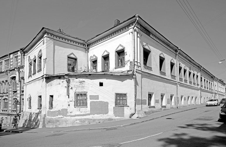 Спустившись вниз с холма, можно выйти к Покровке Колпачным переулком, который был назван по жившим здесь ремесленникам, делавшим головные уборы. Дом № 1, на закругленном углу которого еще недавно был изящный эркер, построен полковником А.Н. Озеровым в 1802 г. На первом его этаже в 1830-х гг. находилась «Покровская» аптека Миндера. Во второй половине XIX в. дом, как и большой участок, выходивший своей задней границей на Покровский бульвар, принадлежал Молчановым, в продолжение многих лет бывших старостами церкви Троицы в Грязях. Один из них – Евграф Владимирович Молчанов – был и храмоздателем нового здания церкви, выстроенного по проекту архитектора М.Д. Быковского в 1861 г. Есть сведения, что дом Молчановых был украшен скульптурами И.П. Витали. В конце XIX в. весь участок перешел к владельцам известного тогда заведения церковной утвари Оловянишниковым. Дом № 3 – отреставрированные палаты XVII–XVIII вв., которые, как выяснилось после исследований искусствоведа Г.И. Науменко, принадлежали религиозному мыслителю Дмитрию Тверитинову, жадно стремившемуся к знаниям, пытливо желавшему все подвергнуть сомнению и найти свое решение в выработке собственного мировоззрения. Жил он в те времена, когда Россия гением Петра пробуждалась от векового сна, да и неудивительно, ведь тогда Петр I провозгласил, что «мы. совести человеческой приневоливать не желаем и охотно предоставляем каждому христианину на его ответственность пещись о спасении души своей».