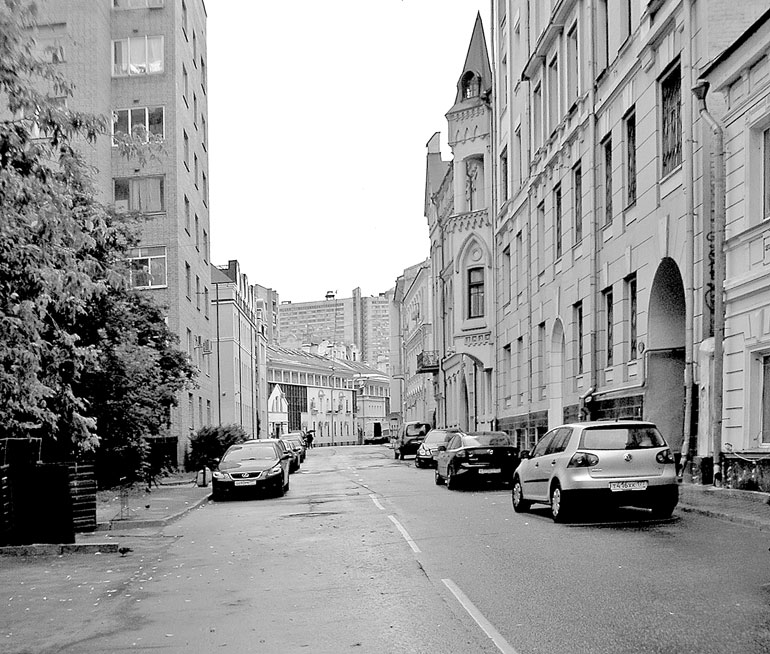 Пречистенский переулок от пересечения со Староконюшенным поворачивается к Пречистенке и выходит к ней Домом ученых (№ 2/16) с правой стороны и новопостроенной подделкой под ампирный дом слева (№ 1/18).