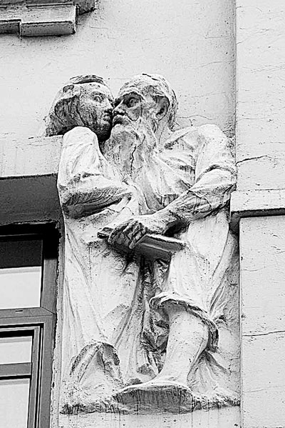 Кто же был автором этого необычного скульптурного фриза? Несмотря на поиски многих знатоков, его имя пока остается неизвестным. Можно, однако, высказать предположение, что им мог быть скульптор Л.С. Синаев-Бернштейн, которому был заказан фриз для украшения портика строящегося здания Музея изящных искусств на Волхонке. Судя по описанию этого фриза, он очень похож на тот, который сейчас можно увидеть в Плотниковом переулке. Скульптор изобразил композицию «Парнас» – процессию из 50 фигур в античных одеждах, направлявшихся к окруженному музами Аполлону, раздающему венки славы художникам, писателям и ученым разных стран (в том числе и России – Гоголю, Тургеневу, Толстому). Особо осведомленные окрестные жители утверждают (в меру своей испорченности), что этот многоэтажный и многоквартирный жилой дом был не чем иным, как. домом терпимости.