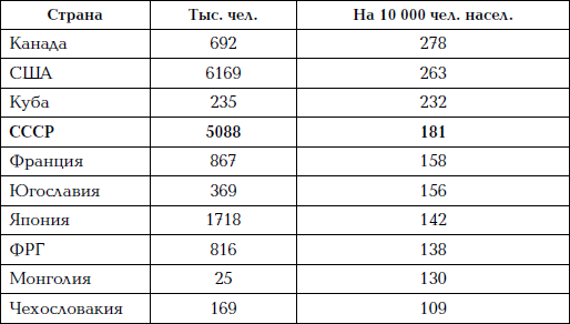По числу врачей (в том числе на 10 тыс. человек населения) мы занимали в 1986 году первое место в мире (42,7 врача на 10 тыс. населения). По удельному показателю на втором месте была Чехословакия, Болгария и Венгрия – на третьем и четвёртом, США – на девятом, Польша – на десятом месте. Япония с 19,8 врача на 10 тыс. населения занимала четырнадцатое место в мире.