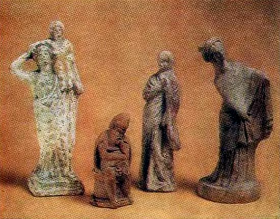 Пантикапей. Терракотовые статуэтки: Деметра с Корой V в. до н. э.; актер, сидящий на алтаре, V–IV вв. до н. э.; стоящая женщина III в. до н. э.; танцовщица II в. до н. э.