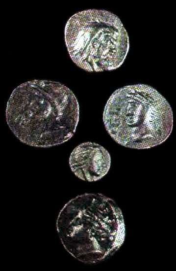 Античные монеты. Лицевая сторона: Пантикапей IV в. до н. э., золото, голова Сатира; Херсонес 47 г. н. э., золото; Ольвия I в. н. э., золото, голова царя Фардзоя; Ольвия, конец IV в. до н. э., голова Деметры; Херсонес II в. до н. э., Дева в зубчатой короне.