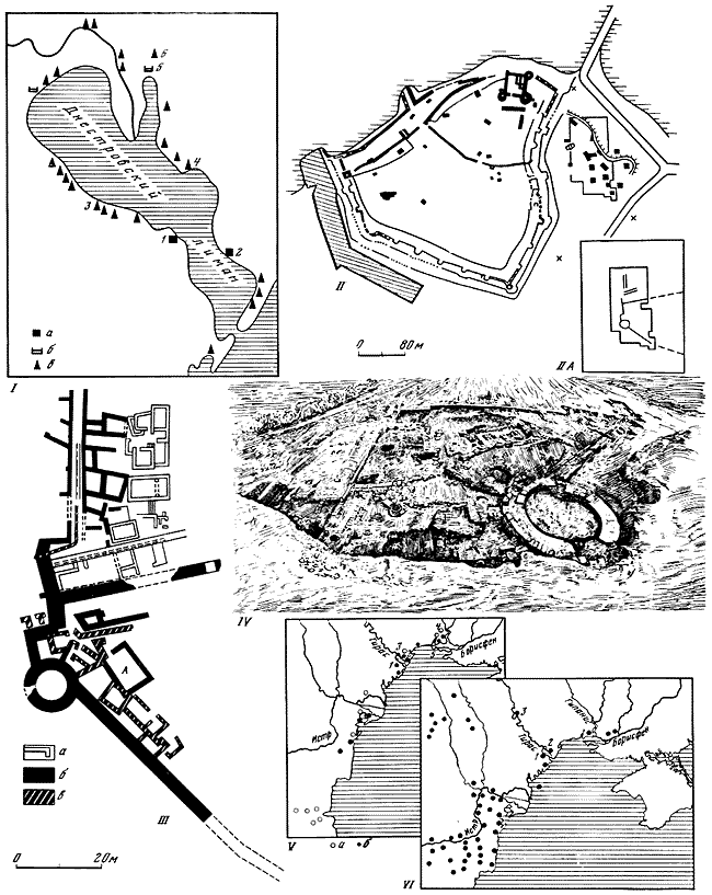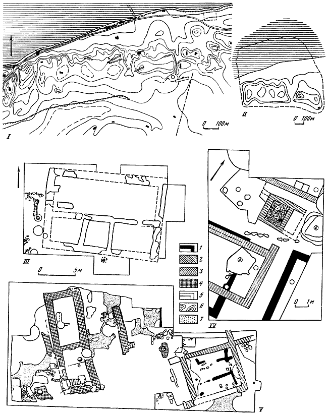 I – схематический план городища с местоположением раскопов; II – восстанавливаемые границы Фанагории; III – план юго-западного раскопа; IV – план раскопа Верхний город; V – план Центрального раскопа: 1 – архитектурные остатки, вторая половина VI в. до н. э.; 2 – первая половина V в. до н. э.; 3 – вторая половина V–I V вв. до н. э.; 4 – II–III вв. н. э.; 5 – IV в. н. 6 – дерево; 7 – вымостка; А, Б – землянки конца VI в. до н. э.