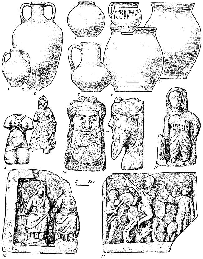 1–7 – глиняные сосуды из помещения 24; 8, 9 – терракотовые статуэтки; 10–12 – памятники скульптуры из помещения 24; 13 – рельеф из помещения 29.