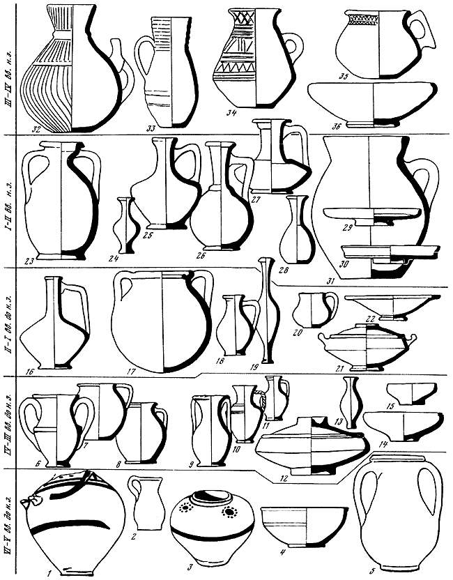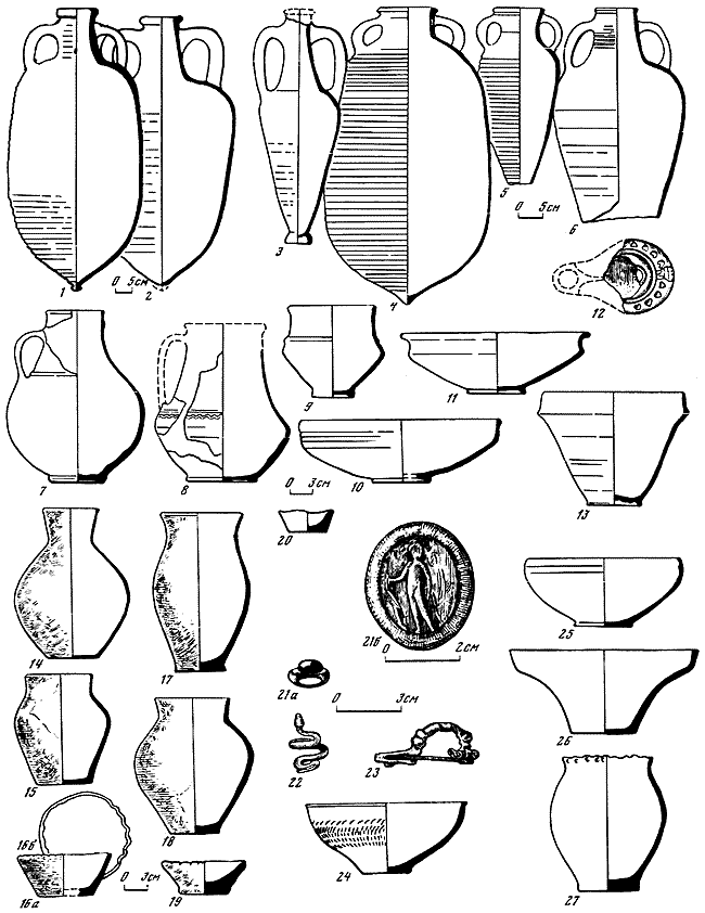1 – ионийская расписная гидрия; 2 – лепной кувшинчик; 3 – ионийский расписной сосуд; 4 – миска; 5 – пелика; 6 – канфар; 7, 8 – одноручные сосуды; 9 – пелика; 10 – кувшины с витой ручкой; 11 – кувшинчик; 12 – лекана; 13 – флакон; 14, 15 – миски; 16 – лагинос; 17 – круглодонный двуручный сосуд; 18 – кувшин; 19 – флакон; 20 – одноручный сосуд; 21 – лекана; 22 – тарелка; 23 – двуручный сосуд; 24, 28 – флаконы; 25 – кувшин; 26, 27 – краснолаковые кувшины; 29 – одноручный сосуд; 30, 31 – краснолаковые тарелки; 32 – сероглиняный лощеный сосуд с зооморфной ручкой; 33 – красноглиняный кувшин с веретенообразным туловом; 34, 35 – сероглиняные лощеные кувшины; 36 – миска.