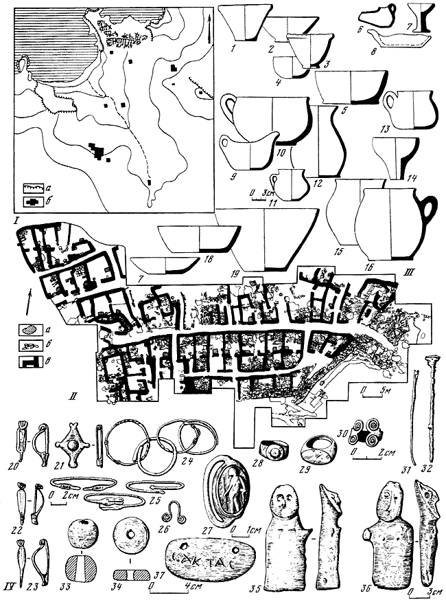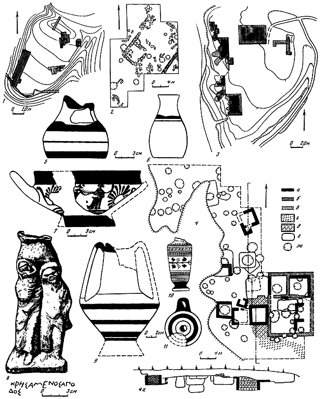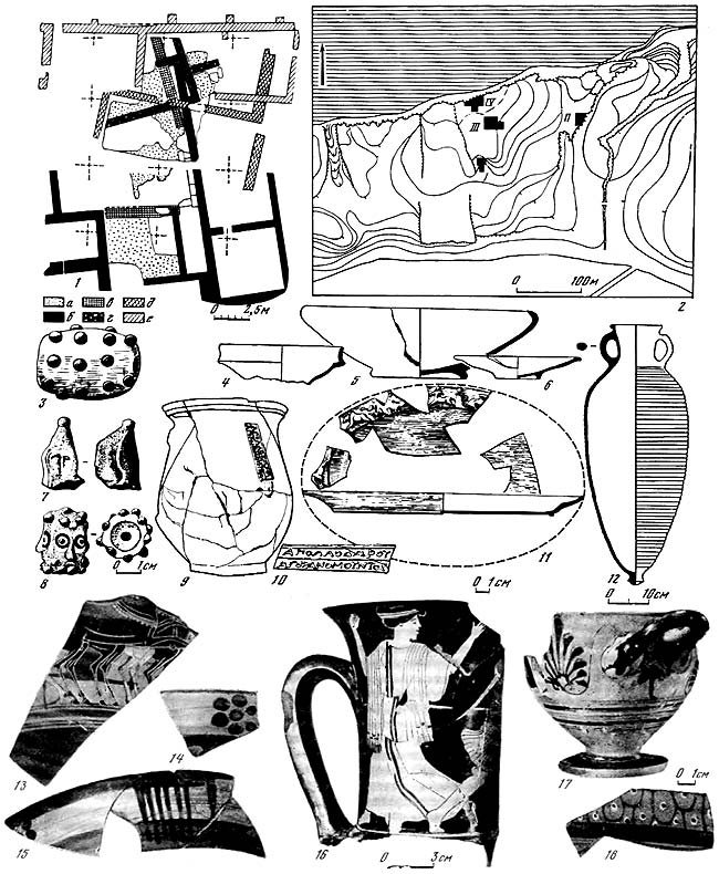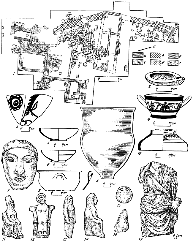 1 – схематический план участка XIV: а – постройка VI в. до н. э.; б – оборонительная стена V в. до н. э.; в – постройки V–IV вв. до н. э.; г – постройки первых веков нашей эры; д – ямы; е – цемянки; 2 – светильник VI в. до н. э.; 3 – обломок края келебы родосско-ионийского стиля, середина VI в. до н. э.; 4 – аттический чернофигурный килик, начало V в. до н. э.; 5 – чернолаковая чаша, VI – начало V в. до н. э.; 6 – чаша с поясками, VI – начало V в. до н. э.; 7 – терракотовая маска, середина VI в. до н. э.; 8 – открытый сосуд; 9 – лощеный сосуд; 10 – нижняя часть глиняного алтаря; 11–14 – терракотовые статуэтки, VI – начало V в. до н. э.; 15–16 – глиняные грузила; 17 – обломок статуэтки Диониса.