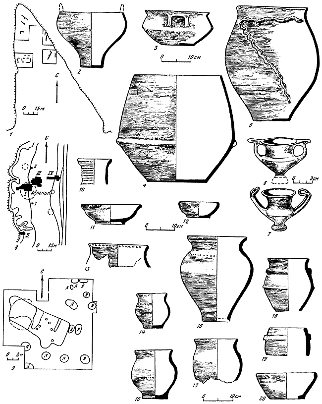 1 – ситуационный план поселения Пивденное с обозначением раскопанных участков; 2–5 – лепная керамика; 6, 7 – аттические чернолаковые сосуды; 8 – ситуационный план поселения Николаевка с обозначением раскопанных участков; 9 – план землянки в северо-восточной части раскопа I (Николаевка); 10–12 – простая античная керамика; 13–17 – скифские лепные горшки; 18–20 – лепная гетская посуда.