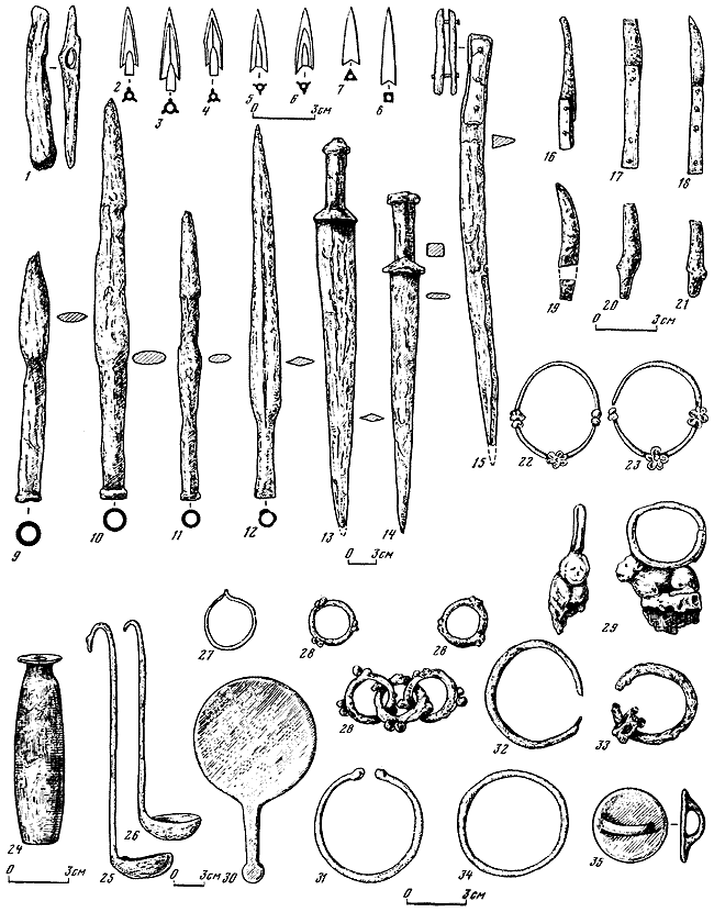 1 – топор; 2–8 – наконечники стрел; 9-12 – наконечники копий; 13–15 – кинжалы; 16–21 – ножи; 22, 23, 27, 29, 33 – серьги и височные подвески; 24 – алебастровый бальзамарий; 25, 26 – киафы; 28 – часть шейного украшения; 30 – зеркало; 31, 32, 34 – браслеты; 35 – бляха.