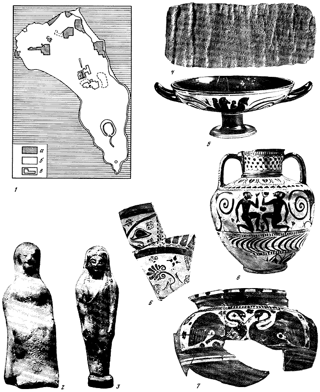 1 – схематический план острова с указанием мест раскопок: а – раскопы; б – котлован; в – постройки нового времени; 2, 3 – терракотовые статуэтки второй половины VI в. до н. э.; 4 – письмо на свинцовой пластинке, конец VI в. до н. э.; 5 – чернофигурный аттический килик, 30-е годы VI в. до н. э.; 6 – фрагмент родосско-ионийской тарелки, третья четверть VII в. до н. э.; 7 – фрагмент родосско-ионийского кратера, вторая четверть VI в. до н. э.; 8 – амфора, расписанная в стиле «фикеллура», альтенбургский мастер, третья четверть VI в. до н. э.