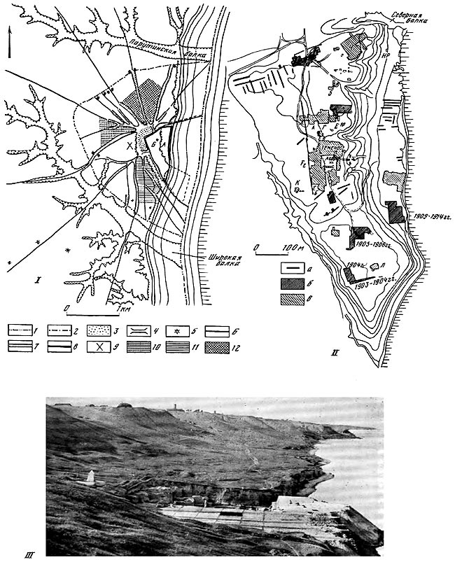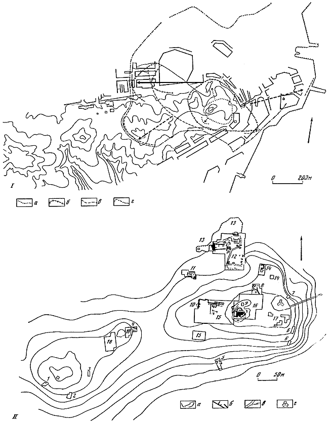 I – план с показом границ города, некрополя, следов древних дорог: 1 – древняя береговая полоса (восстановление); 2 – границы некрополя; 3 – водоем; 4 – древние плотины; 5 – курганы; 6 – древние дороги; 7 – следы древних дорог; 8 – границы городища; 9 – пригород; 10 – некрополь архаического времени; 11 – некрополь классического и раннеэллинистического времени; 12 – некрополь эллинистического времени; А – Нижний город; Б – Верхний город.