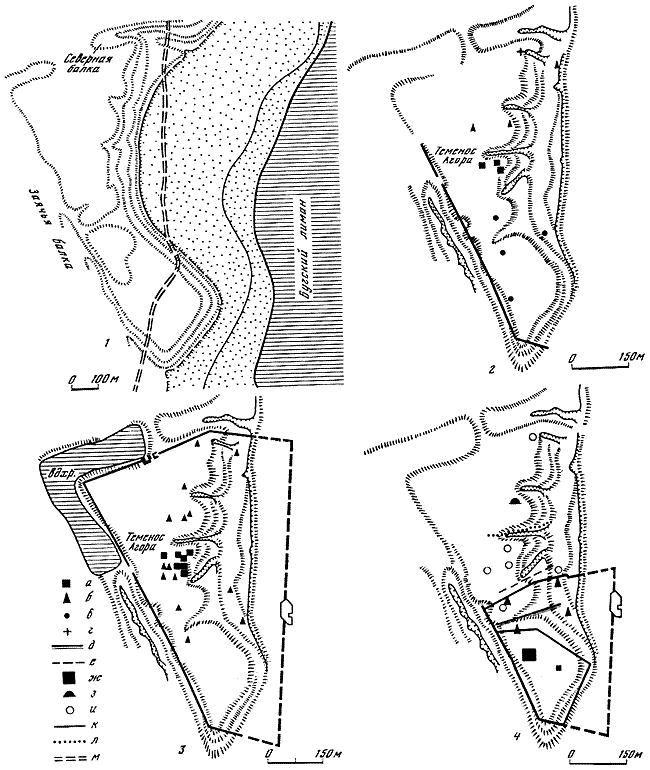 1 – изменение береговой линии; 2–4 – историческая топография Ольвии (2 – VI–V вв. до н. э.; 3 – IV–II вв. до н. э.; 4 – I–III вв. н. э.): а – общественные сооружения; б – жилые дома; в – места находок керамики VI в. до н. э.; г – некрополь; д – первая поперечная балка; е – вторая поперечная балка; ж – цитадель; з – курган; и – производственные сооружения; к – городские стены; л – ров на территории теменоса; м – современная береговая линия.