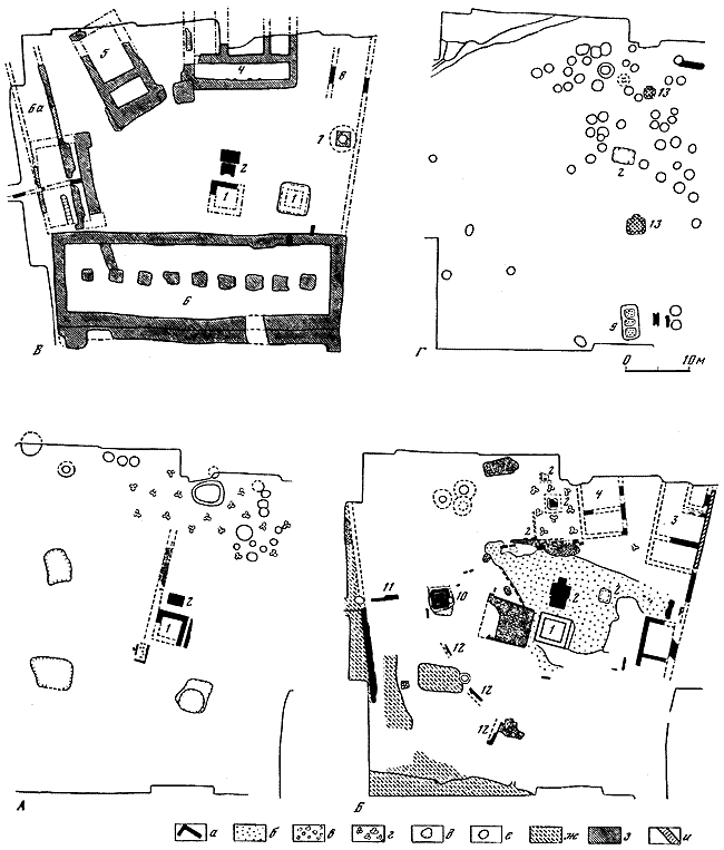 А – VI в. до н. э.; Б – V–IV вв. до н. э.; В – конец IV–II в. до н. э.; Г – I в. н. э.: а – каменные кладки; б – вымостки из щебня и известняковой крошки; в – вымостка из мелкого камня; г – роща; д – углубления в материке; е – ямы; ж – вымостка из черенков; з – слоевые фундаменты; и – трамбовки.