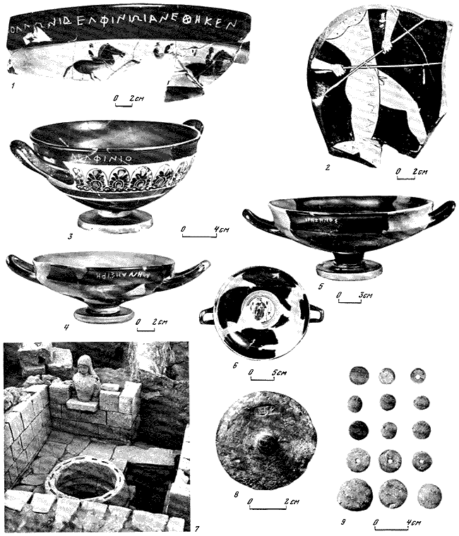 1 – чернофигурный килик с посвящением Аполлону Дельфинию VI в. до н. э.; 2 – медальон краснофигурного килика с посвящением Зевсу и Афине VI в. до н. э.; 3 – чернофигурный килик с посвящением Дельфинию VI в. до н. э.; 4 – чернолаковый килик с посвящением Афине VI в. до н. э.; 5, 6 – чернофигурный килик с посвящением Зевсу VI в. до н. э.; 7 – помещение XI с колодцем и статуей Куроса; 8 – бронзовая исефа с клеймом IPEA IV в. до н. э.; 9 – глиняные счетные фишки из дикастерия.