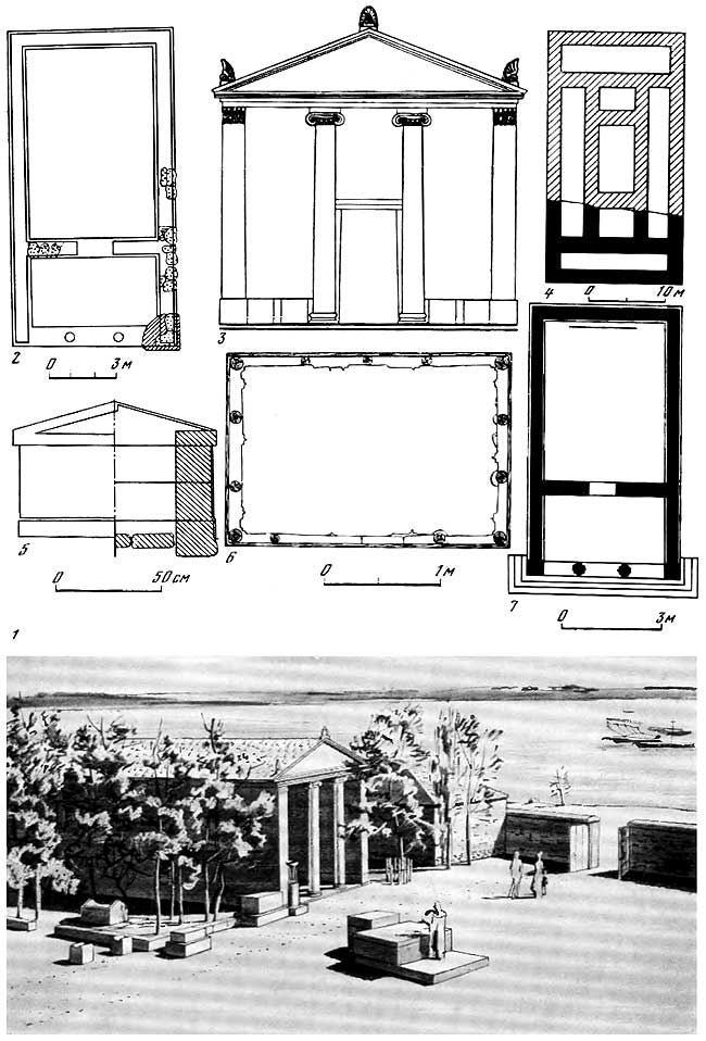 1 – реконструкция площади перед храмом Аполлона V в. до н. э.; 2, 3 – план и фасад храма Аполлона V в. до н. э.; 4 – храм Аполлона конца IV–III в. до н. э.; 5 – жертвенник V в. до н. э.; 6 – план деревянного алтаря I в. н. э.; 7 – план храма Зевса III в. до н. э.
