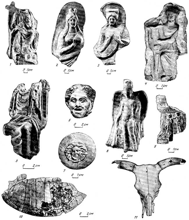 1 – Кибела; 2 – Афродита; 3 – Деметра; 4 – форма для оттиска статуэтки Аполлона III в. до н. э. (к востоку от храма Аполлона); 5 – Зевс, 6 – Сатир; 7 – Медуза; 8 – крылатый гений – Иакх; 9 – часть алтарика – Посейдон и Афродита; 10 – панцирь черепахи; 11 – череп быка.