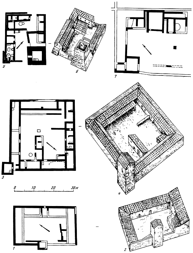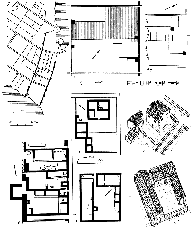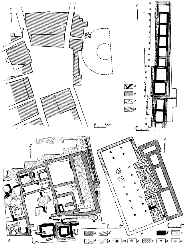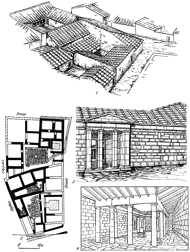 1 – общий вид дома Е2, район агоры (реконструкция С.Д. Крыжицкого); 2 – план жилого квартала в Нижнем городе; 3, 4 – дом с алтарем в Нижнем городе (реконструкции Б.В. Фармаковского и Калачева).