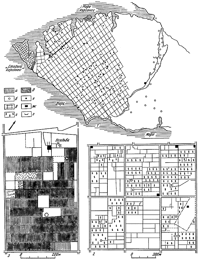 1 – земельные наделы и поселения на Гераклейском и Маячном полуостровах; 2 – группа типичных земельных наделов на Гераклейском полуострове; 3 – земельный надел № 26 с усадьбой.