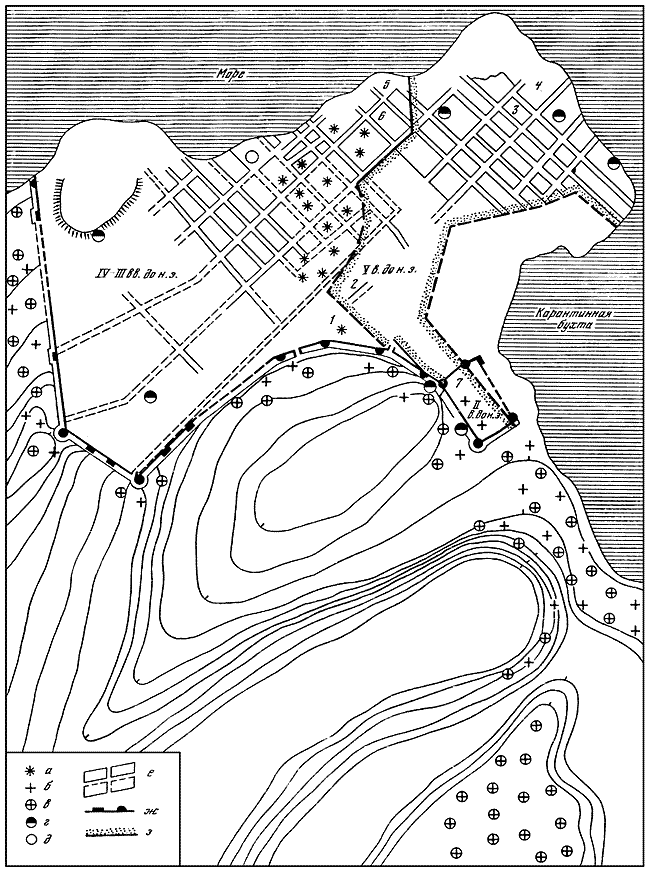 а – некрополь V–IV вв. до н. э.; б – некрополь III II вв. до н. э.; в – некрополь I–IV вв. н. э.; г – гончарные мастерские; д – стеклоделательная печь; е – жилые кварталы; ж – оборонительные стены; з – примерные границы города в V–IV вв. до н. э.