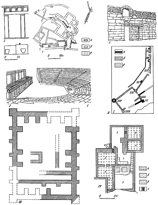 I – античный театр: 1 – план раскопа: а – строительные остатки III–II вв. до н. э.; б – перестройки первых веков нашей эры; в – средневековая застройка театрального участка; 2 – часть основания проскения III–II вв. до н. э. со следами опор; вверху – часть фасада проскения у левого парода (реконструкция О.И. Домбровского); 3 – театр III–II вв. до н. э. (реконструкция Т.Л. Жаворонковой).
