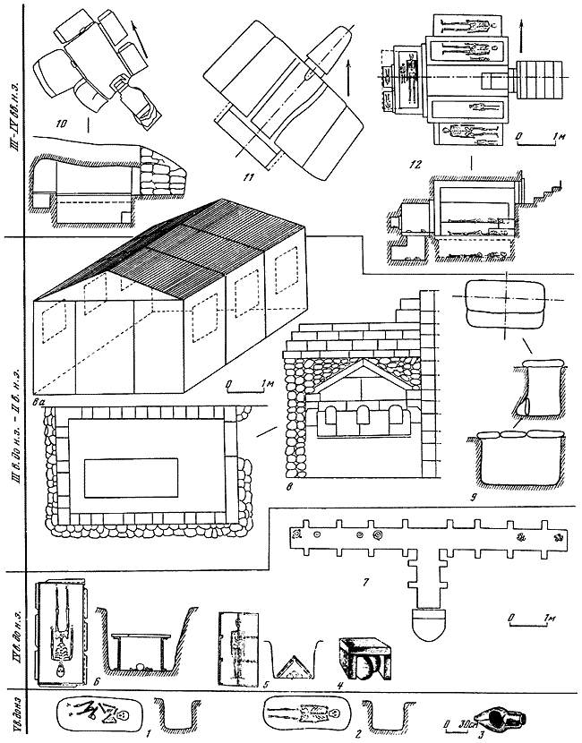1, 2 – грунтовые могилы; 3 – захоронении в амфоре на Северном берегу; 4 – погребение в урне; 5, 6 – могила с черепицей и каменной обкладкой; 7 – план склепа 1012; 8 – пристенный склеп 1013, план, разрезы, внутренние стены с нишами; 8а – аксонометрия склепа 1014; 9 – план и разрезы подбойной могилы; 10, 11, 12 – склепы позднеримского времени (планы и разрезы).