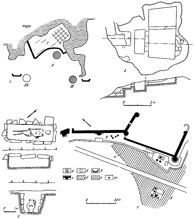 1 – план расположения поселений и некрополей: I – Херсонес; II – поселок гончаров; III – поселок виноделов, IV – поселок каменщиков; 2 – винодельня, вырубленная в скале у верховья Карантинной бухты; 3 – типы погребений в некрополе у Песочной бухты; 4 – район гончарных мастерских: а – поселение; б – предполагаемое поселение; в – некрополь; г – крепостные стены; д – предполагаемый район производственного поселения; е – протейхизма; ж – керамические печи.