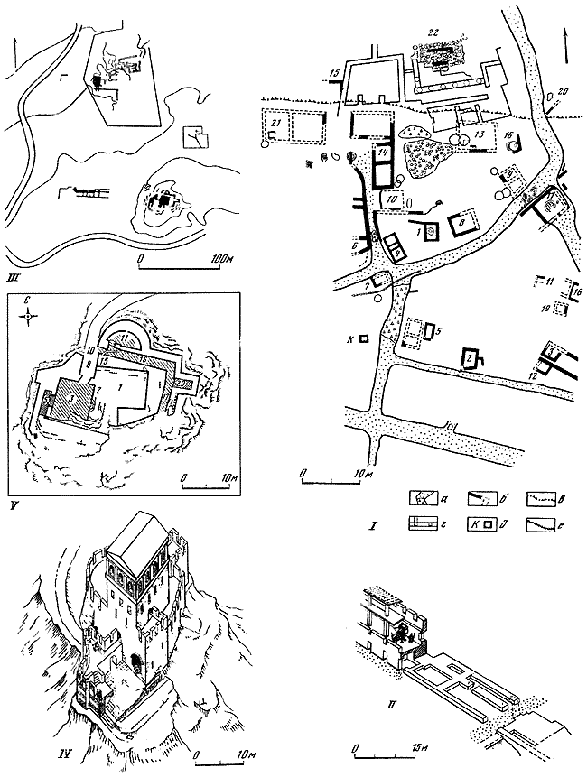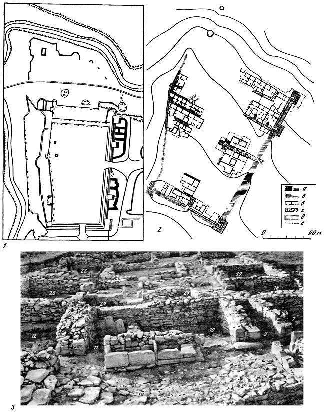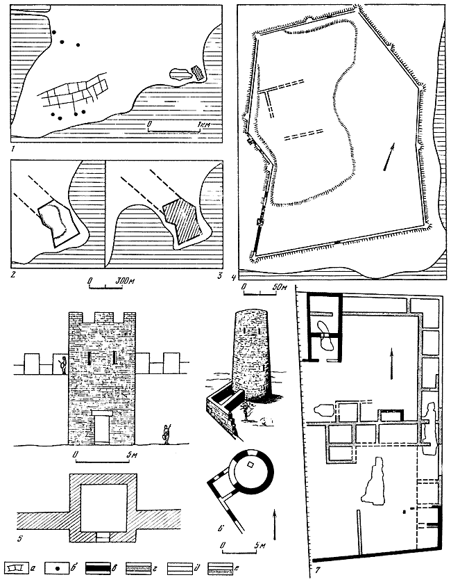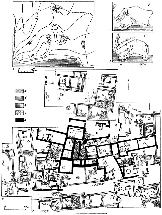 1 – план городища, составленный П. Дюбрюксом; 2 – план городища с обозначением раскопанных участков (а – оборонительные стены, вскрытые раскопками, б – нераскопанные участки оборонительных стен, в – раскопанные жилые дома, г – улица, д – постройка средневековой эпохи, е – границы раскопов); 3, 4 – помещения у юго-западной оборонительной стены.