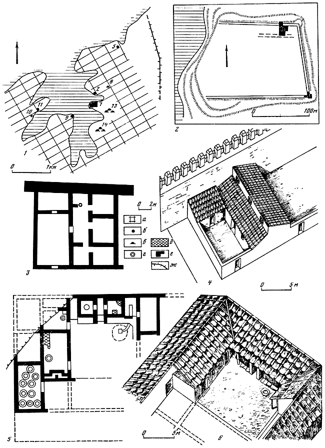 1 – земледельческая округа – следы размежевания; 2 – план городища; 3, 4 – план и реконструкции жилого дома Прекрасной гавани (раскопки М.А. Наливкиной, реконструкция А.И. Щеглова); 5–6 – сельская усадьба у бухты Ветреной.