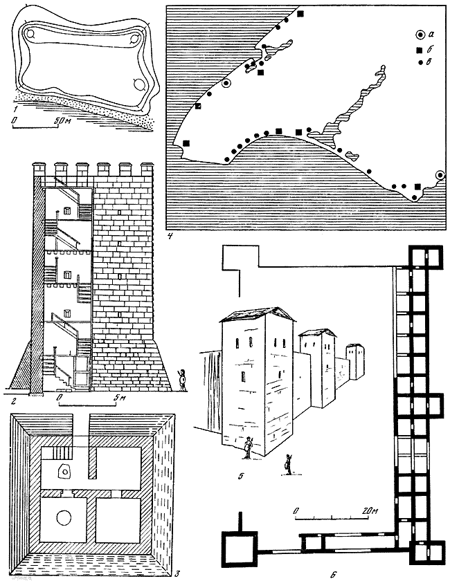 1 – Караджинское городище; 2–3 – башня укрепленной усадьбы «Беляус» (раскопки О.Д. Дашевской, реконструкция А.Н. Щеглова); 4 – схема расположения поселений (а – города, б – крупные укрепления, в – изолированные укрепленные и неукрепленные усадьбы); 5, 6 – укрепления на городище «Чайка» (раскопки А.Н. Карасева, реконструкция А.Н. Щеглова).