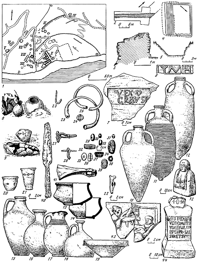 1 – генеральный план раскопок (I – Нимфей, II – термы, III – таврская стена, IV – башня, V – ворота, VI – наружная оборонительная стена, VII – пустырь, VIII – внутренняя оборонительная стена); 2, 3 – нижняя оборонительная стена, план и разрез; 4, 5 – нимфей, план и разрез; 6 – надпись из нимфея; 7 – обломок черепицы с клеймом вексилляции Равенской эскадры; 8, 9 – могилы 10 и 15 с трупосожжением IV в. н. э.; 10–12 – амфоры, использовавшиеся в качестве урн (из могил 26, 33, 29); 13, 14 – сероглиняные чашки (из могил 28 и 22); 15–10 – сосуды (из могил 29, 18, 21, 28); 20, 21 – стаканы с синими глазками (из могил 15, 33); 22 – ручка сосуда в виде животного (из могилы 15); 23 – рыболовный крючок (из могилы 10); 24 – пряжка; 25, 26 – браслеты (из могилы 19); 27, 28 – фибулы (из могилы 33); 29–39 – бусы; 40 – наконечник копья (из могилы 18); 41 – топор (из могилы 19); 42 – надгробие; 43 – рельеф с изображением фракийского всадника из святилища бенефициариев; 44 – алтарь из святилища бенефициариев.