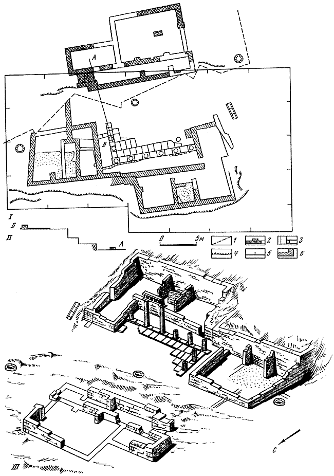 II – разрез по линии А-Б (север-юг); 6 – помещения общественного комплекса II в. до н. э.