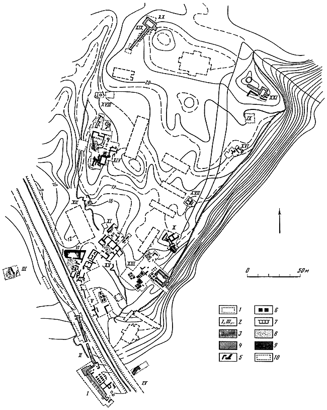 1 – раскопанные участки; 2 – номера раскопов; 3 – оборонительная стена V в. до н. э.; 4 – оборонительная стена эллинистического времени; 5 – стены зданий античной эпохи; 6 – рыбозасолочные ванны; 7 – резервуары виноделен; 8 – каменные вымостки; 9 – стены зданий средневекового времени; 10 – застройка XX в.