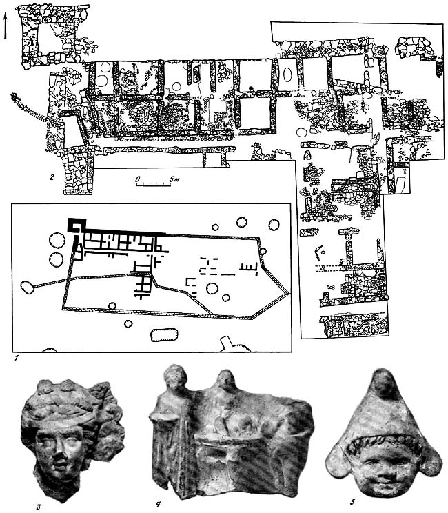 1 – план городища; 2 – план раскопанного участка; 3–5 – импортные терракоты.