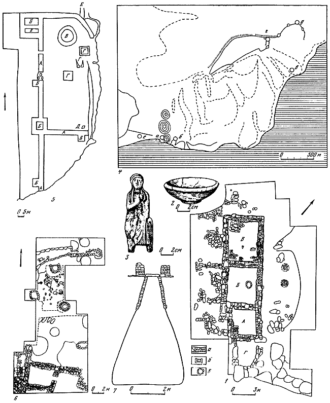 1 – план раскопа «холм А»: А-Г – помещения: а – кладки стен; б – очаги; в – ямы; 2 – миска; 3 – терракотовая статуэтка V в. до н. э.; 4 – план горы Опук (по Ю.Ю. Марти) с указанием расположения раскопов: а – «Змеиный холм» (1940–1949 гг.); б – Береговой (1950–1951 гг.); в – «холм А» (1950–1951 гг.); г – цитадель на горе Опук; д – восточная оборонительная стена; е – западная оборонительная стена; 5 – план цитадели на плато горы Опук: А – стена; Б – башни; В – круглая башня; Г – пещеры в скале; Д – яма; Е – начало городской стены; 6 – план раскопа «Береговой»; 7 – разрез зерновой ямы на раскопе «Береговой».