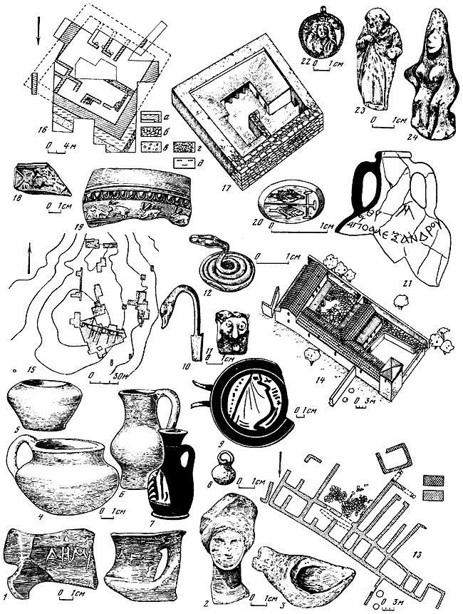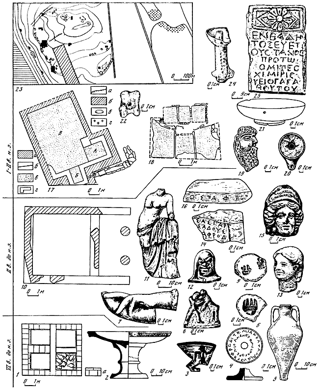 1 – план архаического дома; 2 – жертвенное блюдо; 3 – фрагмент расписного открытого сосуда VI в. до н. э.; 4 – ножка килика с граффити (нижняя плоскость, профиль); 5 – амфора VI в. до н. э.; 6 – клеймо кепской мастерской; 7 – мраморная женская рука с рогом изобилия; 8 – терракота – мальчик с козлом; 9 – клеймо кепской мастерской, навершие крышки леканы; 10 – план фундамента святилища II в. до н. э.; 11 – мраморная статуэтка Афродиты; 12 – фрагмент ручки сосуда с изображением комической маски II–I вв. до н. э.; 13 – голова Куроса VI в. до н. э.; 14 – мраморный постамент с посвящением Афродите; 15 – терракота – голова Афродиты I в. до н. э. – I в. н. э.; 16 – фрагмент мраморного жертвенного блюда с надписью; 17 – план терм I в. н. э. (а – фундаменты терм, б – мраморная облицовка, в – цемянковый пол, г – скамьи из цемянки); 18 – винодельня I в. н. э.; 19 – костяная пластина в виде головы Силена, аппликация мебели I в. до н. э. – I в. н. э.; 20 – светильник I в. н. э.; 21 – краснолаковая миска; 22 – игральная кость – астрагал; 23 – план городища и некрополя Кеп: а – береговой обрыв; б – поселок с огородами; в – ямы; г – некрополь Кеп; 24 – светильник III–IV вв. н. э.; 25 – позднеантичное надгробие.