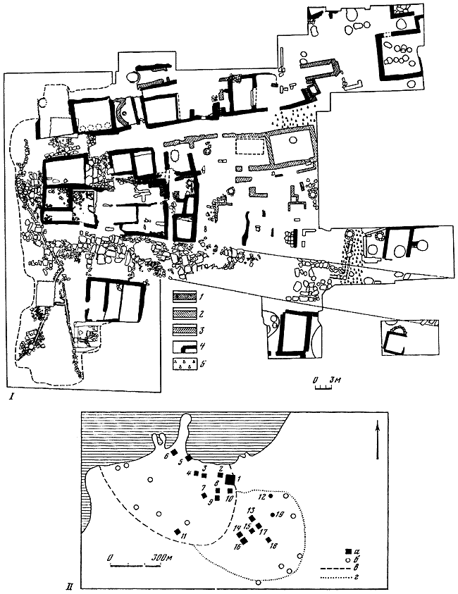 I – ситуационный план расположения раскопов: а – выходы скалы; б – площади раскопов.