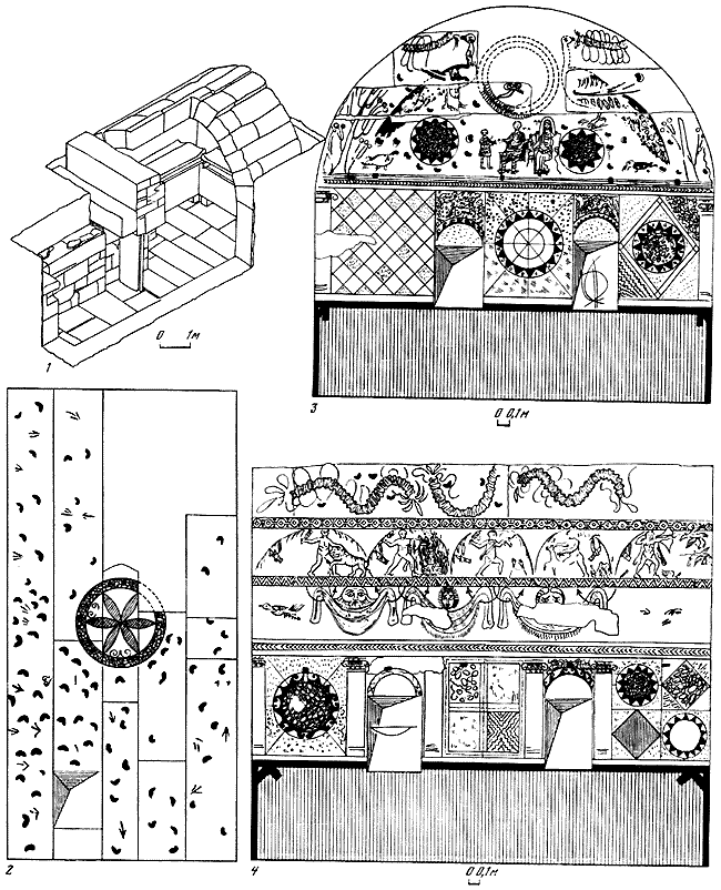 1 – аксонометрия склепа; 2 – свод склепа; 3 – роспись стоны напротив входа; 4 – роспись боковой стены.