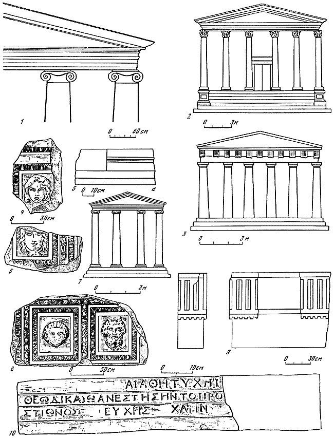 1 – восстановление фрагмента фасада здания ионийского ордера; 2 – реконструкция храма коринфского ордера I–II вв. н. э.; 3 – реконструкция храма дорического ордера IV–III вв. до н. э.; 4, 6 – кассеты с горгонейоном (4 – из Эрмитажа, 6 – из раскопок Анапы); 5 – фрагмент ионического антаблемента; 7 – реконструкция храма ионического ордера II–I вв. до н. э.; 8 – блок с двумя кассетами (изображения Силена и Пана) из Гай-Кодзора (Анапский район); 9 – фрагмент дорийского антаблемента; 10 – фрагмент ионического архитрава с посвящением «Богу высочайшему».