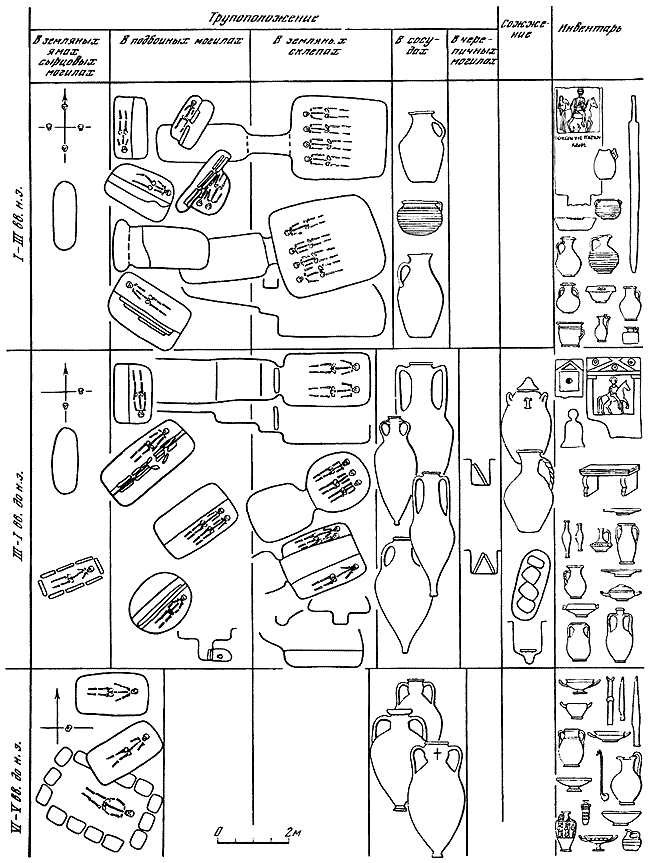 В I–II вв. н. э. количество насыпных курганов еще более сокращается. Почти все склепы имеют полуциркульные перекрытия, оштукатурены и расписаны. Широко используются старые курганы и иногда склепы. Большое распространение находит обряд захоронения в деревянных гробах или саркофагах. Значительная часть курганных погребений совершена по греческому погребальному обряду.