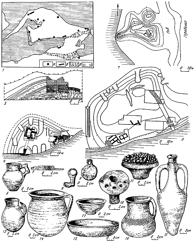 1 – общий план городища Надлиманское с обозначением раскопанных участков; 2 – строительные остатки на раскопе «В» городища Надлиманского; 3 – план городища Никоний с обозначением раскопанных участков; 4 – план строительных остатков на юго-западном участке Никония: а – каменные стены; б – сырцовые стены; в – слоевые фундаменты; г – вымостка улицы; д – вымостка дворца; е – землянка; ж – яма; 4а – разрез по линии С-Ю юго-западного участка; 5–7, 9-11 – импортная керамика из ранних напластовании Никония; 8, 8а – фигурный сосуд из Никония с граффити на тыльной стороне.