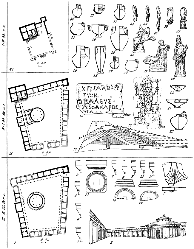 1 – реконструкция плана архитектурного ансамбля и толоса второй половины III – середины II в. до н. э.; 2 – реконструкция юго-западной части перистильного двора и толоса; 3-11 – профили капителей колонн дорического ордера; 12 – дорическая капитель: общий вид и вид снизу; 13–14 – базы ионийского ордера; 15 – фрагмент мраморных солнечных часов; 16 – план архитектурного ансамбля, превращенного в резиденцию Хрисалиска (конец II – конец I в, до н. э.); 17 – вал, разрез северной части; 18–40 – находки из дома Хрисалиска: 18 – плита с надписью; 19 – изображение на плите; 20–32 – керамика; 33–35 – обрывки веревки; 36–37 – части деревянной мебели; 38–40 – терракоты из домашнего святилища; 41 – реконструкция плана крепости I–II вв. н. э.