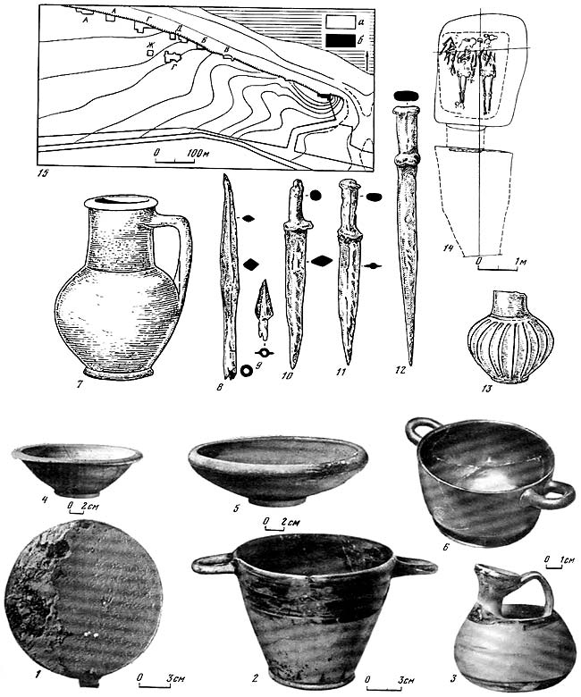 1 – зеркало бронзовое из могилы 106; 2 – скифос коринфский начала V в. до н. э. из могилы 106; 3 – аск начала V в. до н. э. из могилы 144; 4, 5 – миски V в. до н. э. из могилы 149; 6 – скифос чернолаковый V в. до н. э.; 7 – кувшин красноглиняный из склепа 78 II в. до н. э.; 8-12 – железные мечи-акинаки, наконечники копья и стрелы VI – начала V в. до н. э. из могилы 95, 88, 145; 13 – сероглиняный сосуд из склепа 78 II в. до н. э.; 14 – план склепа 78 (а – раскопы на территории некрополя; б – раскоп на городище); 15 – схематический план расположения раскопов.