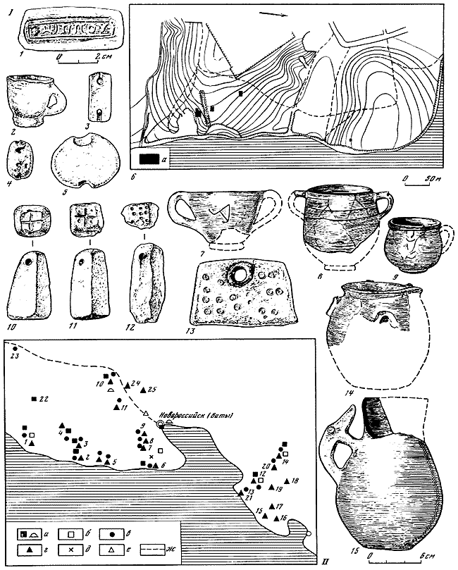 1 – клеймо на ручке амфоры; 2 – лепная кружка; 3, 4 – глиняные грузила; 5 – каменное грузило; 6 – схематический план поселения (а – раскопанные участки); 7 – сероглиняный канфар; 8 – краснолаковый сосуд; 9 – коричневолаковый сосуд; 10–12 – глиняные грузила; 13 – керамическая плитка; 14 – лепной горшок; 15 – сероглиняный горшок.