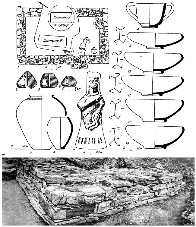 1 – план здания; 2–4 – глиняные пряслица; 5 – пифос; 6 – лепной сосуд; 7 – часть терракотовой статуэтки богини; 8 – сероглиняный канфар; 9-13 – сероглиняные миски с тамгообразными знаками; 14 – юго-восточный угол здания (по материалам раскопок Н.А. Онайко в 1971 и 1977 гг.).