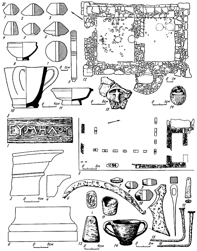 I – Раевское городище: 1 – клеймо на горгиппийской черепице; 2 – план здания; 3 – фрагмент каменной капители; 4 – фрагмент каменного карниза; 5 – база столба; 6 – железный серп; 7 – сердоликовая буса; 8-10 – глиняные пряслица; 11 – глиняная льячка; 12 – точильный камень; 13 – глиняное грузило; 14 – сероглиняный канфар; 15 – топор; 16 – гвозди.
