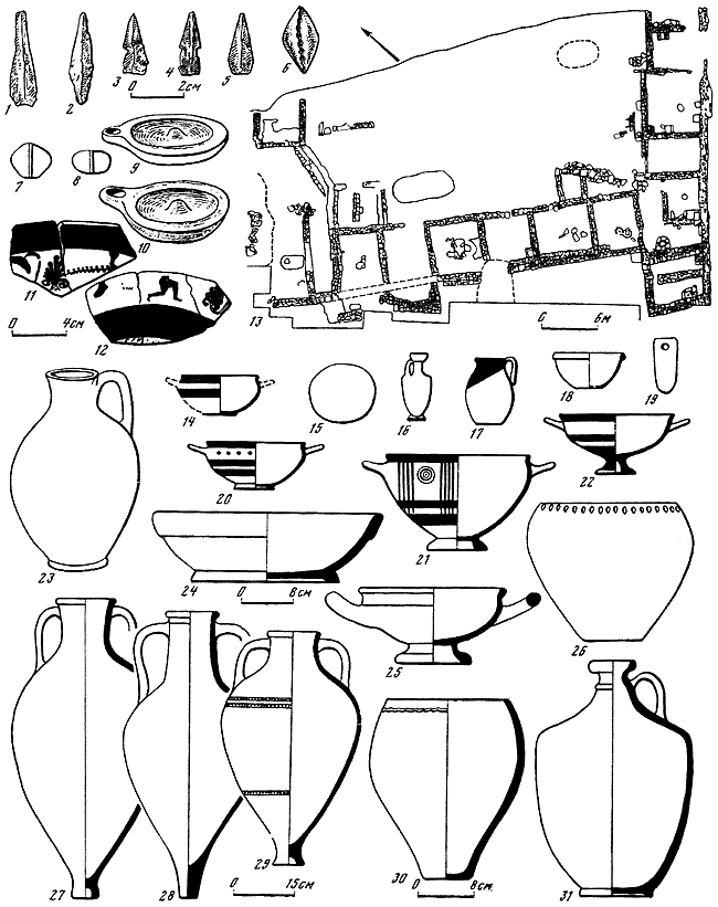 1–5 – наконечники стрел; 6 – раковина каури; 7, 8 – глиняные пряслица; 9, 10 – светильники; 11, 12 – фрагменты чернофигурных сосудов; 13 – план здания; 14 – ионийский килик; 15 – глиняное грузило; 16 – лекиф; 17 – ионийский сосуд; 18 – ионийская чашечка; 19 – точильный камень; 20–22 – ионийские килики; 23 – ионийский кувшин; 24 – чаша; 25 – чернолаковый килик; 26, 30 – лепные горшки; 27–29 – амфоры; 31 – ионийский лекиф.