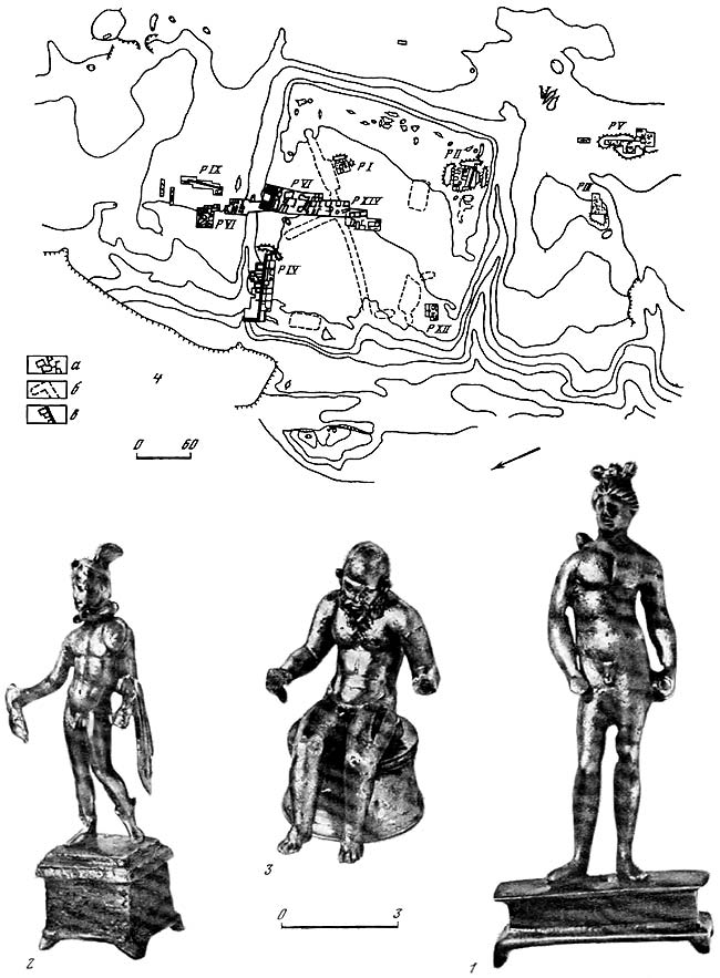 1, 2, 3 – бронзовые статуэтки; 4 – план городища, снятый в 1958 г. Ю.Б. Самылимым с дополнениями Т.М. Арсеньевой: а – раскопы; б – следы прежних траншей и раскопов; в – городские стены.