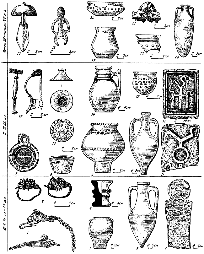 1 – цепочка с головами грифонов на концах II в. до н. э.; 2 – серьги II в. до н. э.; 3 – лепной горшок I в. н. э.; 4 – лепная курильница, III–II вв. до н. э.; 5 – родосская амфора II в. до н. э.; 6 – антропоморфное надгробие; 7 – зеркало, II–III вв.; 8 – лепная курильница, II–III вв.; 9 – лепной горшок, первая половина III в.; 10 – светлоглиняная амфора первая половина III в.; 11, 12 – плиты с рельефными тамгообразными знаками боспорских царей; 13 – штамп, первая половина III в.; 14 – серолощеный кувшин с зооморфной ручкой; 15 – фиала, первая половина III в.; 16 – фибула, II – первая половина III в.; 17 – фибула IV в. н. э.; 18 – бляшка, конец IV – начало V в.; 19 – лепной горшок, конец IV – начало V в.; 20 – лепная миска, конец IV – начало V в.; 21 – гребень, конец IV – начало V в.; 22 – фрагмент фиалы, конец IV – начало V в.; 23 – амфора, конец IV – начало V в.
