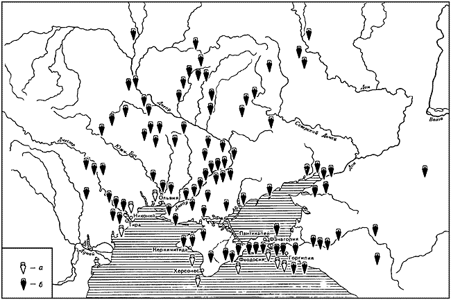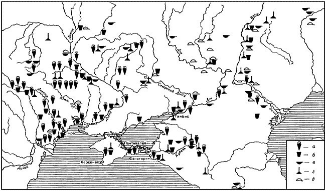 Наиболее ранние археологические свидетельства регулярного импорта вина в Скифию и другие территории туземных племен Северного Причерноморья относятся еще к VI в. до н. э. В VI–V вв. до н. э., как и в самих греческих городах, наиболее широким в варварской среде был импорт хиосского вина, в определенном, но значительно меньшем количестве, вина Самоса, Лесбоса и некоторых других неизвестных центров. Особенно интенсивным в это время греческий импорт был (если не считать ближайшего варварского окружения городов) в среднем Приднепровье, у лесостепных племен (Онайко Н.А., 1966а), а также в нижнем Прикубанье (синды, меоты) (Зеест И.Б., 1960). С V в. до н. э. во все возрастающем объеме начинает импортироваться фасосское вино. Главным посредником в греко-варварской торговле в это время была Ольвия, откуда импорт поступал не только на обширные лесостепные территории Приднепровья, но, возможно, и далее на восток, в частности в бассейн Северского Донца. В Северо-Восточном Причерноморье эти же функции выполнял Пантикапей и города азиатского Боспора – Фанагория и Гермонасса. Помимо вина, еще в начальный период регулярной греко-варварской торговли в те же районы поступает греческая художественная и столовая посуда. Древнейшие образцы ее относятся к концу VII в. и, как правило, являются дорогими художественными, порою уникальными изделиями. Большинство их происходит из погребений кочевнической знати. В VI и начале V в. до н. э. это керамика из ионийских центров и аттическая, в V в. до н. э. – главным образом аттическая (Онайко Н.А., 1966а; Брашинский И.Б., 1976в), а отчасти и местного северочерноморского производства. В некотором количестве импортировались также предметы вооружения главным образом оборонительные доспехи (шлемы, кнемиды); в основном их импорт падает уже на IV в. до н. э. (Черненко Е.В., 1968). Ввозилась и металлическая посуда (табл. LXXII) и различные украшения (Онайко Н.А., 1966а; Петренко В.Г., 1978). Особо широкого размаха греко-варварская торговля в Северном Причерноморье достигает в IV в. до н. э.